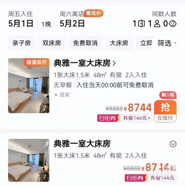 4月19日,有网民发布信息称,在网络平台查询到汕头多家酒店“五一”期间价格飙升,其中甚至出现大床房标价高达8888元。由于网络线索未明确涉事主体具体信息,核查难度较大。接到线索后,汕头市市场监管局当晚立即组织执法力量,对主流住宿预订平台开展逐户排查比对,最终锁定涉事房源为位于华侨试验区一家网约房。