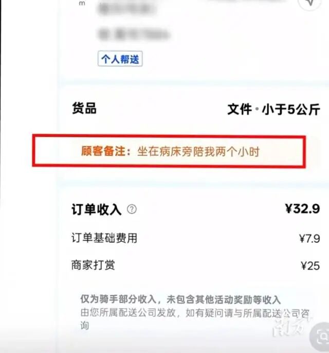 被探望的女孩叫小黎,24岁,患有一种罕见的血液系统恶性肿瘤,病情总体可控,但住院的日子漫长难熬,家人又无法长时间陪伴。4月15日,小黎突然想到在外卖平台上下单,找一名骑手来陪她一会,于是发出一条不需要取送货的订单,备注写着:“坐在病床旁陪我两个小时。”